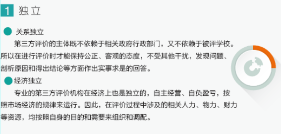 第三方评价机构之所以能够在市场和社会上得到认可和赞誉,在很大程度上取决于其出色的专业化的评价理念、人才储备、技术支持和制度保障。首先,评价活动是一种复杂的、专业性极强的活动,不仅需要先进的评价理念,还需要专业的评价理论的支持,更需要技术过硬的专业人员的参与,而这些恰恰是内部评价所不具备的。以评价人员的专业性来说,他们不仅要熟悉教育的规律,能够将相关教育评估理论、技术和方法运用到实践活动中,还要对评价活动、程序以及可能出现的意外状况进行科学、周密的计划和设计。